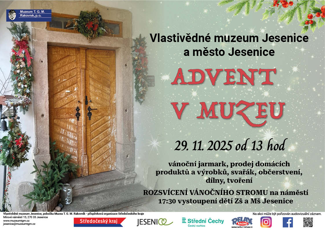 Vlastivědné muzeum Jesenice, ve spolupráci s městem Jesenice, srdečně zve na Advent v muzeu. Tradiční předvánoční akce se bude konat 29. 11. od 13 hodin v muzeu. Večer pak bude pokračovat rozsvícením vánočního stromu na náměstí v 17:30. Těšit se můžete na jarmark rukodělných dárečků, svařák, medovinu, občerstvení a hezkou vánoční atmosféru. Připravena bude i dílnička pro děti.