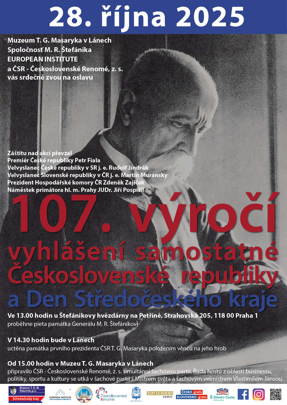 Muzeum T. G. Masaryka v Lánech, Spoločnosť M. R. Štefánika, EUROPEAN INSTITUTE a společnost ČSR - ČESKOSLOVENSKÉ RENOMÉ, z.s. si vás dovolují pozvat dne 28. října 2025 na oslavu 107. výročí založení samostatné Československé republiky a Den Středočeského kraje.