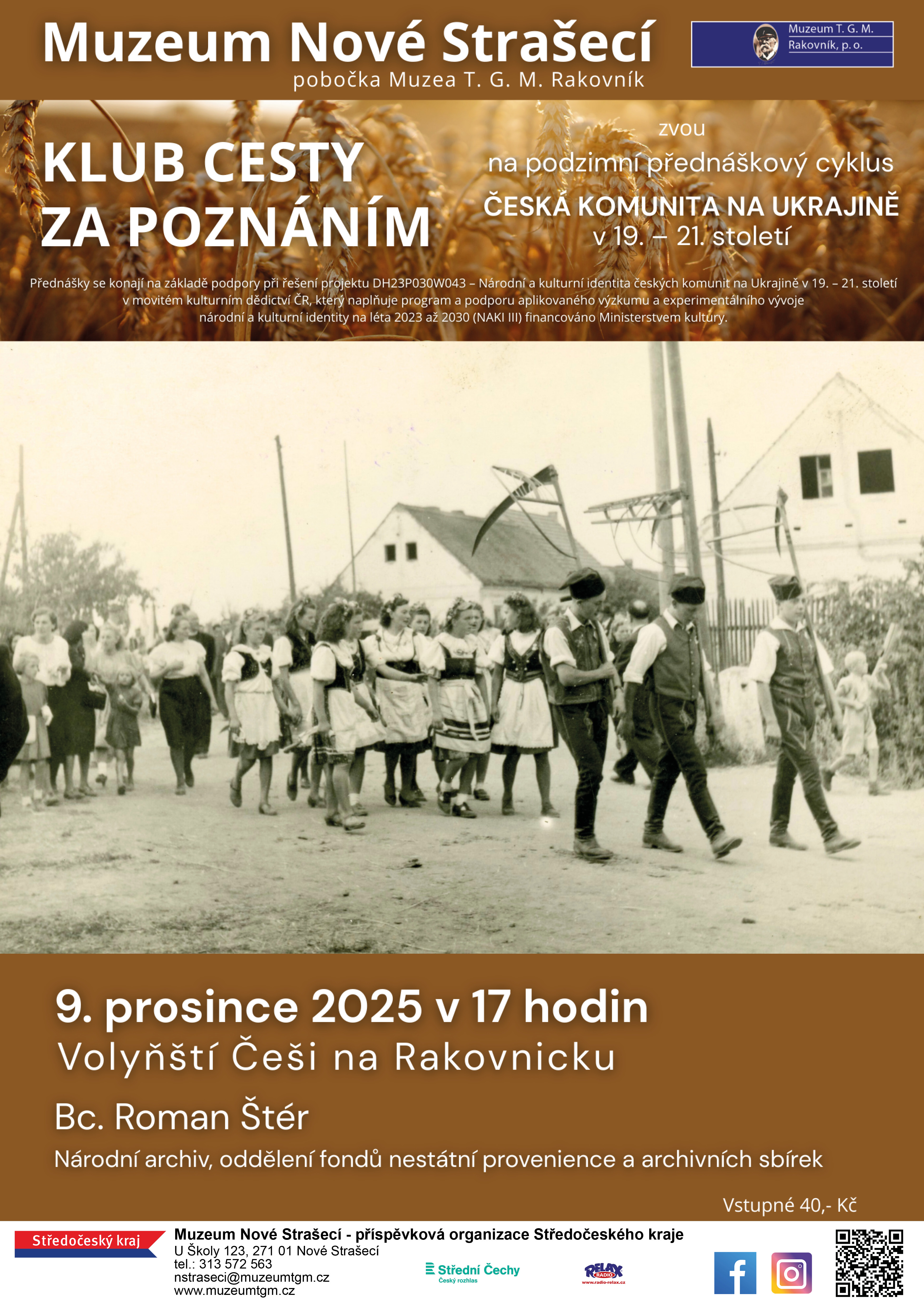 Srdečně vás zveme na závěrečnou přednášku cyklu Česká komunita na Ukrajině v 19. - 21. století, která se uskuteční v úterý 9. prosince 2025 od 17 hodin. Přednášku s názvem „Volyňští Češi na Rakovnicku“ povede Bc. Roman Štér z Národního archivu v Praze, odborník na fondy nestátní provenience a archivní sbírky.
