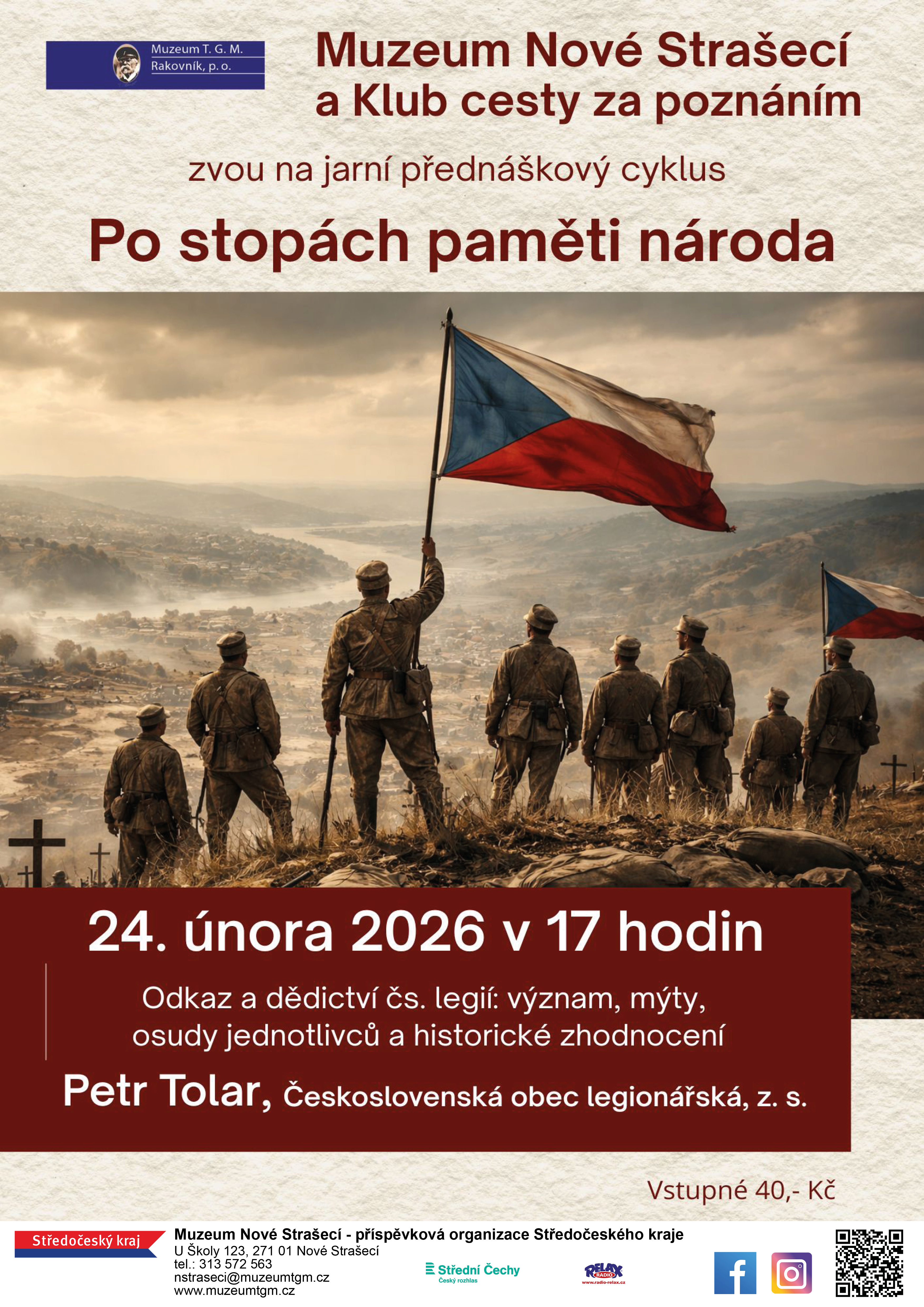 Klub cesty za poznáním ve spolupráci s Muzeem Nové Strašecí vás srdečně zve na druhou přednášku jarního přednáškového cyklu Po stopách paměti národa věnovanou významu a odkazu československých legií. Přednáška s názvem „Odkaz a dědictví čs. legií: význam, mýty, osudy jednotlivců a historické zhodnocení“ se uskuteční v úterý 24. února 2026 v 17 hodin a jejím přednášejícím bude Petr Tolar z Československé obce legionářské (ČsOL), významné organizace, která sdružuje veterány, odborníky i zájemce o legionářskou historii. Právě Petr Tolar se dlouhodobě věnuje propagaci legionářských tradic a jejich významu pro české národní dějiny.